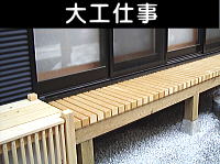 エクステリア外構工事。「檜」(ヒノキ)素材「濡れ縁」「室外機カバー」。等々、これら大工仕事は大得意です!