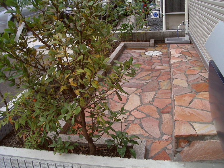 お庭の洋風敷石と花壇の造作植栽。可愛くて、若奥様には大好評です。