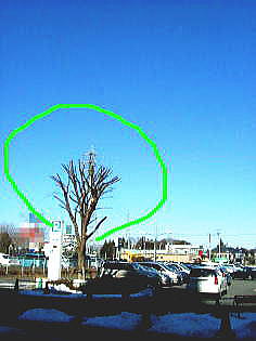 左の写真の丸い線の形で2本とも繁っていました。もう1本は写真外の左側にあります。 大勢のお客様がご来店しますので、落ち葉が無いようにしたいとの店長様のお考えです。